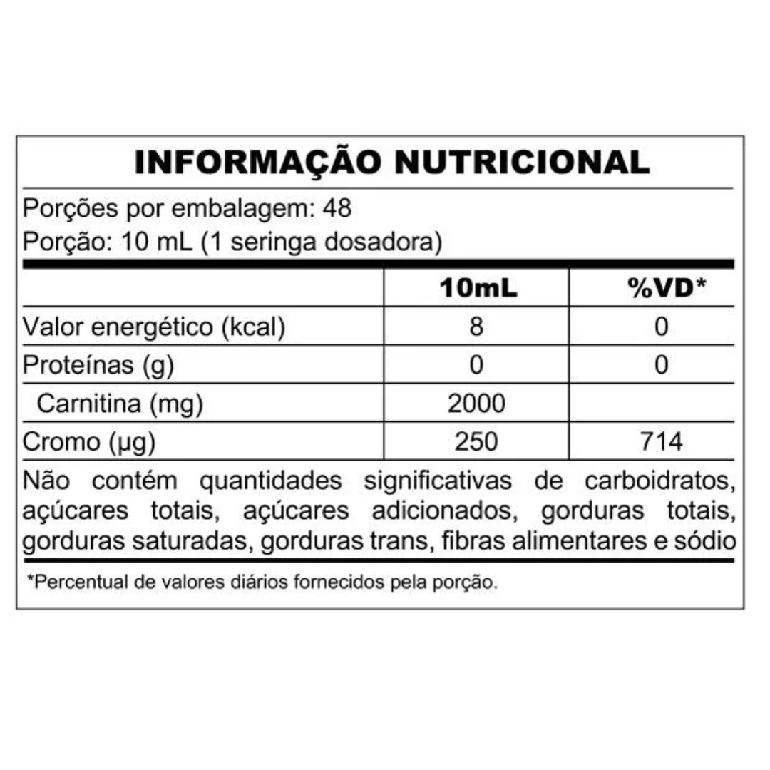 Água purificada, tartarato de L-carnitina, picolinato de cromo, conservante benzoato de sódio e sorbato de potássio, estabilizante goma xantana, aromatizante idêntico ao natural, edulcorante sucralose e acessulfame de potássio, corante amarelo crepúsculo e azul brilhante FCF.